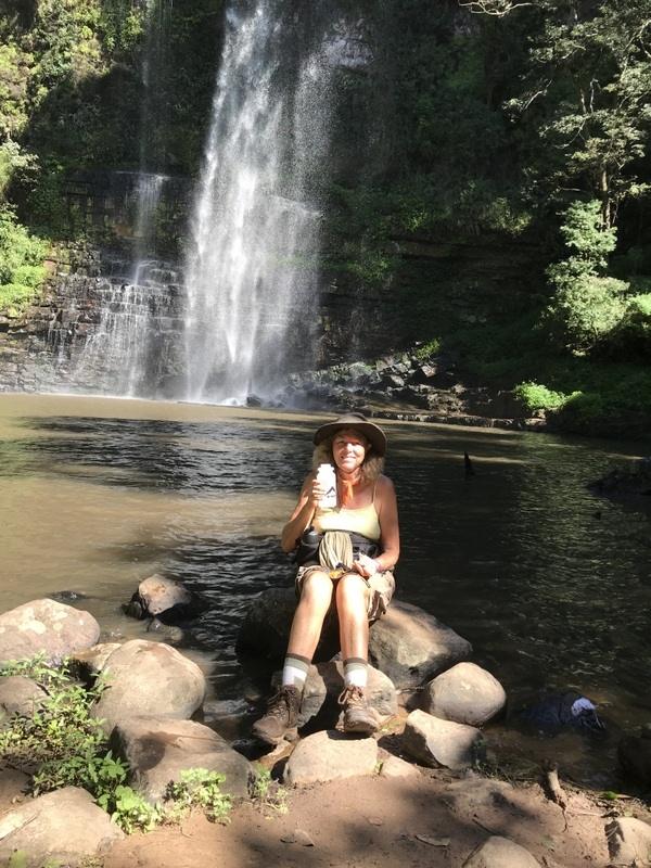 Brian led us down a steep descent and under the N2 bridges - modern works of art, whereunder he gave us a brief, but fascinating talk on the way they were constructed! We proceeded from there to the spectacular MacIntosh Falls and enjoyed a breakfast break. Here I managed to obtain two soft mints from Charmaine's generous hand and through subterfuge, pretending it was for my wife, managed to scale a third! Later on at lunch I repaid her kindness with some slap chips at the rate of three to one, after some tough bargaining! Brian and Janet gathered together a bag of litter and our Leader carried it down to the Entrance complex. Here we enjoyed a well earned lunch under a magnificent shade tree (ID to be confirmed).