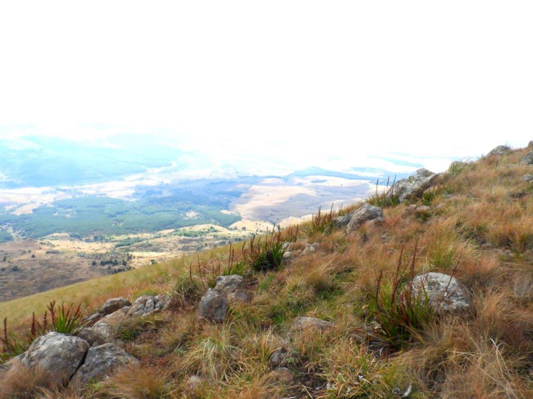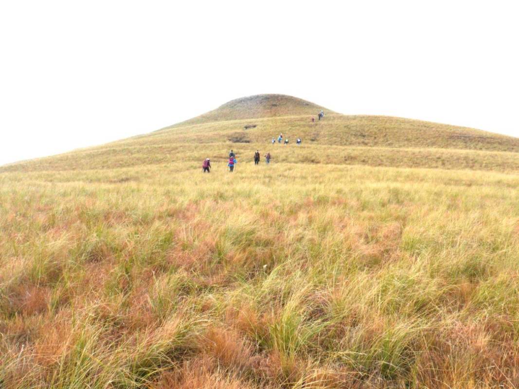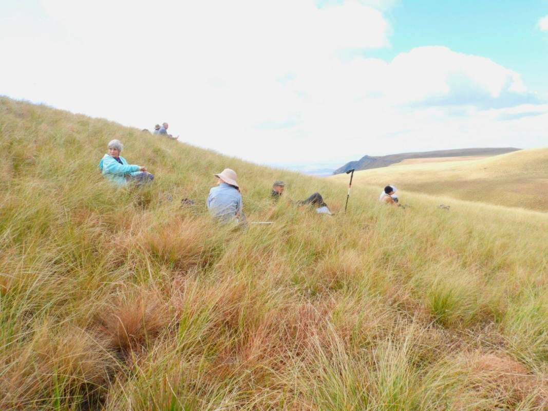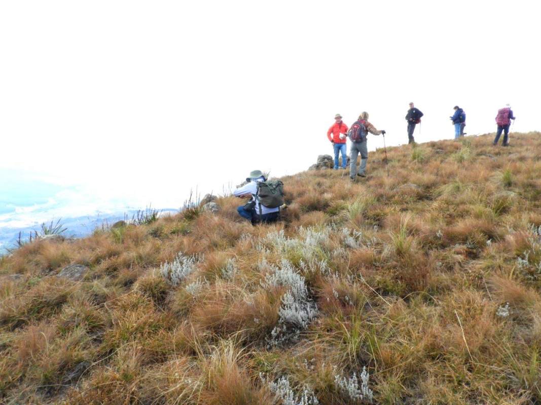 The path was lost in very long overgrown and lying down grass, so a new detour was taken across the seeming never to end undulating, pathless grass lands. However we came to the area where we had stopped the recce yesterday because of no path ahead of us, found our tracks and followed, and soon were back on the homeward track. A breather was taken once were on a god track, and looking back we could see the high ridge of Mt Lebanon, our goal for the day.