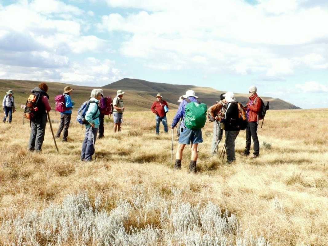 The views from this high vantage point are incredible - 360 degrees to anywhere, unfortunately drifting clouds did play hide and seek with what one could see at any given moment. Then a very bright patch of sunlight would open up the view, and cause one to reach for sunglasses. The wind was chippy so la lunch spot with as little wind as possible was sought, lunch taken with magic views, and then it was time to head for home. Here again , the downhill stretch of the mountain was a bit attention demanding, so the hike line was stretched, but never out of sight, and as we reached the flats, a rest and catch-up break was had.
