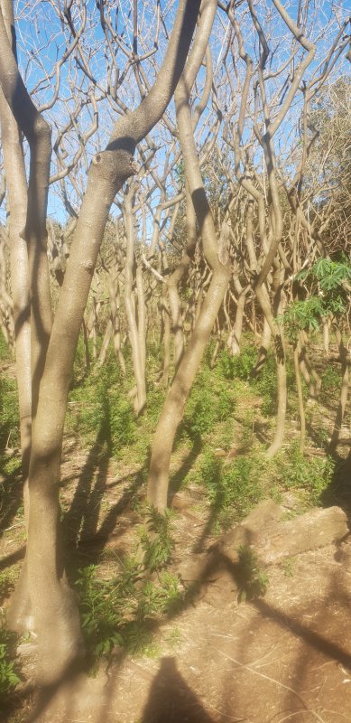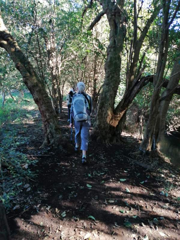 The last stage of the walk took us back into the open cropland section and an amazing sight - a group of 60 plus Crowned Cranes feeding in the remains of the Maize crop. This is the more abundant of our three Crane species but still an uncommon and wonderful twitch! We were unable to access the old farmhouse so took a track back toward our starting point with two other great sightings - a pair of Ground Hornbills, a rare and endangered species and a huge Ficus sp.-most probably natalensis and reputedly 140 years old. This gnarled giant is a magnificent specimen - these trees are an amazing mini ecosystem all of their own providing food , shelter, nesting sites, habitat for small mammals, birds, bats, insects and reptiles plus fruit on the ground for larger mammals. The last few hundred metres saw us(apart from some younger speed merchants ,wife included) drag our weary bodies to the finish and a welcome spot of tea, coffee and a few Ales and the like. A great finish to another wonderful hike with our friends of the MHC.