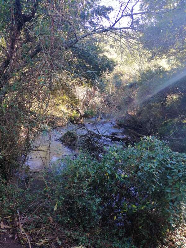We crossed the last section of open cropland and entered the riverine forest and trail next to a strongly flowing stream. Again, everything we saw confirmed what a well-run property this is. Neat signage, indicator dye and ring barking on alien trees and significantly, plenty of spoor - small and large antelope, water mongoose, slender mongoose and Bush Pig, their presence indicated by frequent grubs along the pathway. We also had a fleeting glimpse obscured by trees of what were almost certainly three Bushbuck, the only other possibility of that size being Reedbuck, but there was no characteristic alarm whistle so the former was probably the correct entry on the checklist! This time of the year is not the best for identifying trees and species diversity is much lower at this inland altitude but we saw Dovyalis sp. Coddia rudis and a large number of Halleria lucida with their nectar laden yellow to orange flowers strewn on the path at intervals. After approximately an hour and a half's walk Brian led us over a low level bridge, necessitating a removal and carrying of 'tackies,' and brief immersion in icy waters. We stopped briefly for tea and scones on the other side and then headed uphill to the contour road through a wattle plantation, offering beautiful views over the farm and its immaculate infrastructure including orchards, crops and a famous Piggery!! All along the road we checked for spoor with plenty of evidence of wildlife and occasional dog tracks. We descended once again to the farmlands below and crossed a simple timber and cable suspension bridge certified safe to cross by the Trails Resident Engineer and leader Brian! After a further walk back alongside the stream we stopped for lunch and enjoyed the warm sunshine filtering through the trees.
