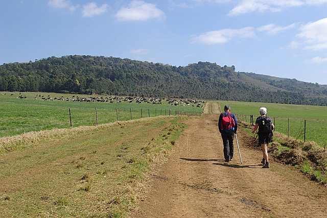We continued our hike passing another well-known Midlands Meander destination, the Mole Hill, where we briefly stopped to browse the shops, glass studio and art gallery. Then it was back along farm roads flanked by lush green pastures to the dairy where we were able to watch the mechanised milking of 800 fully-laden udders of friesland cows. The cows exit at about 10 second intervals. This is one of the most productive dairy farms in the Midlands.