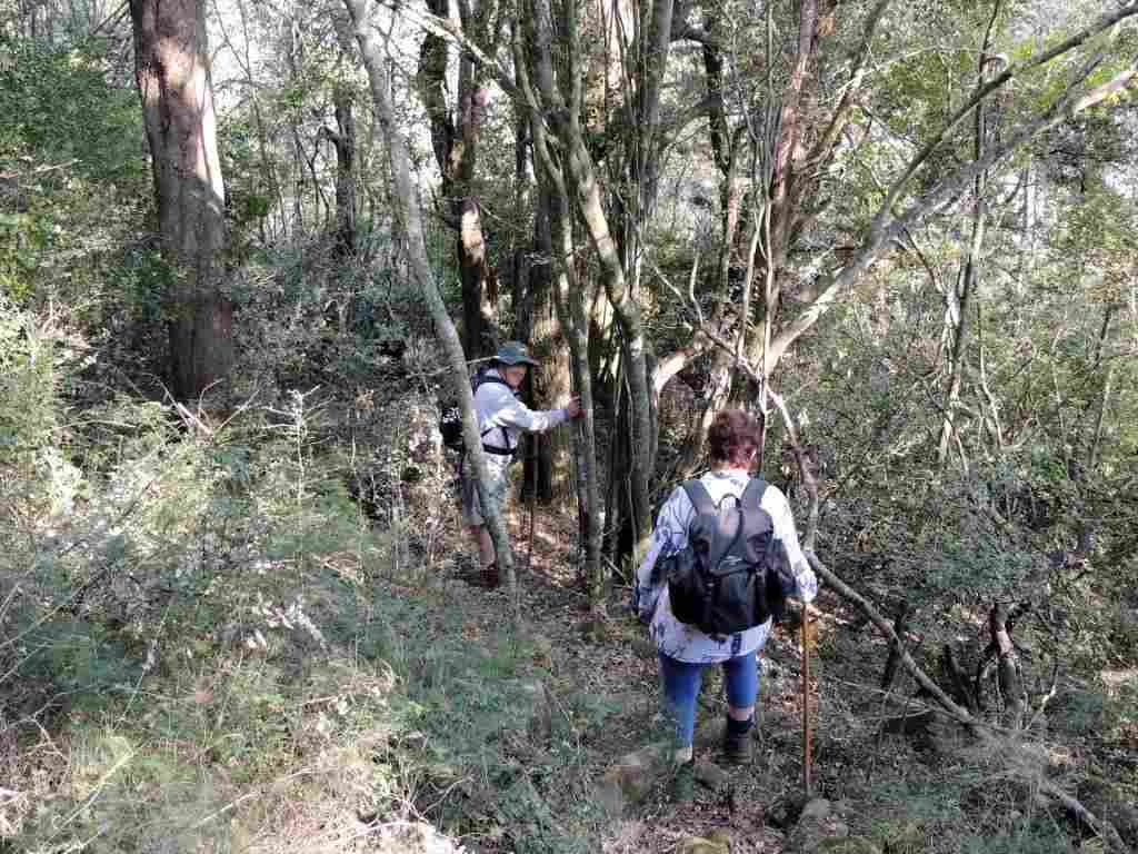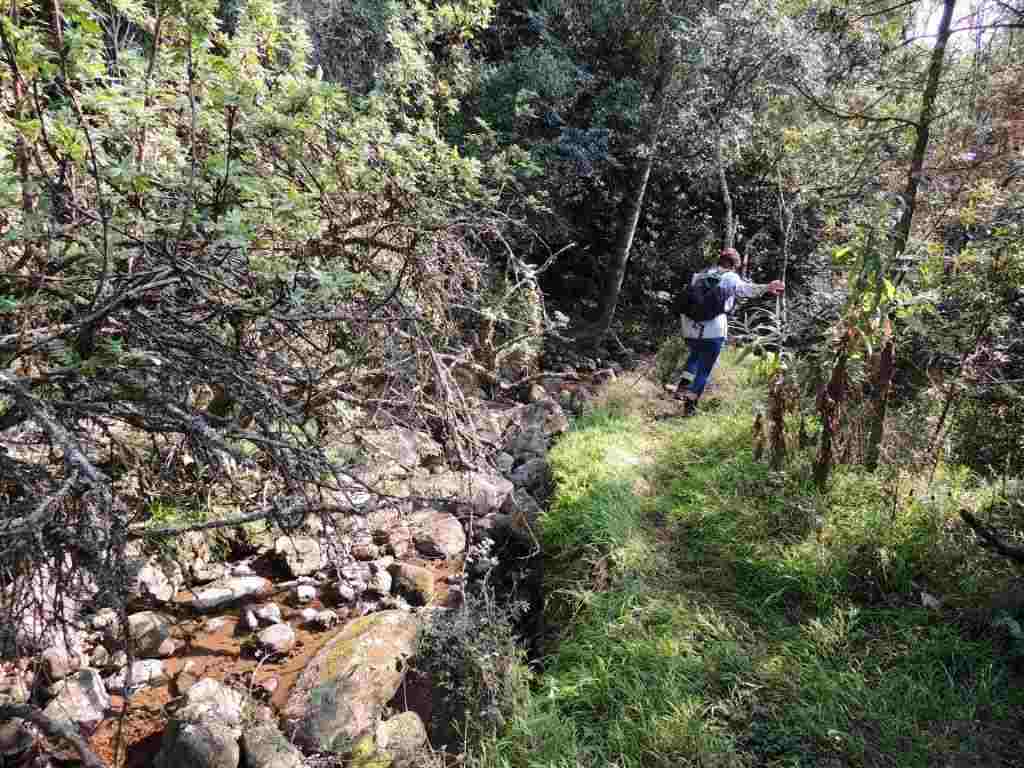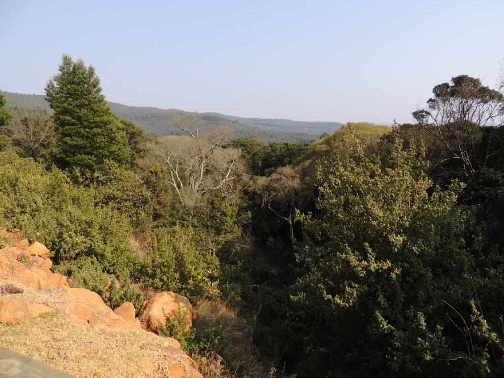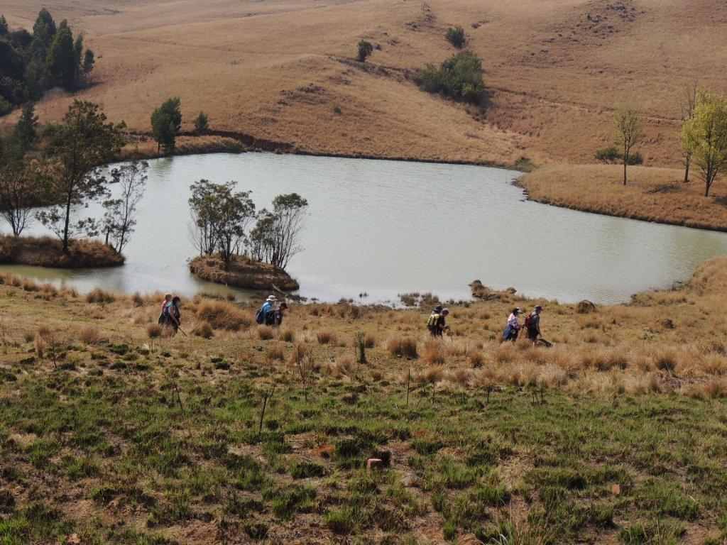 From the Lapa, the paths drops steeply through a lovely natural forest area down to a clear sparkling cool stream at the bottom of the valley. As the path is new, extra care was taken negotiating some of the steeper sharper stony bits of path. Once out of the forest, a good grassy vehicle path was followed for the rest of the walk. The path followed down to a dam, then wounds it way up a longish hill, where a rest break followed. The slower walkers gradually made their way up the hill. From the top hazy views were offered of the lowlands below.