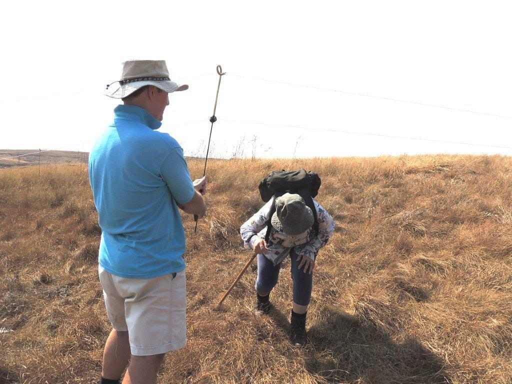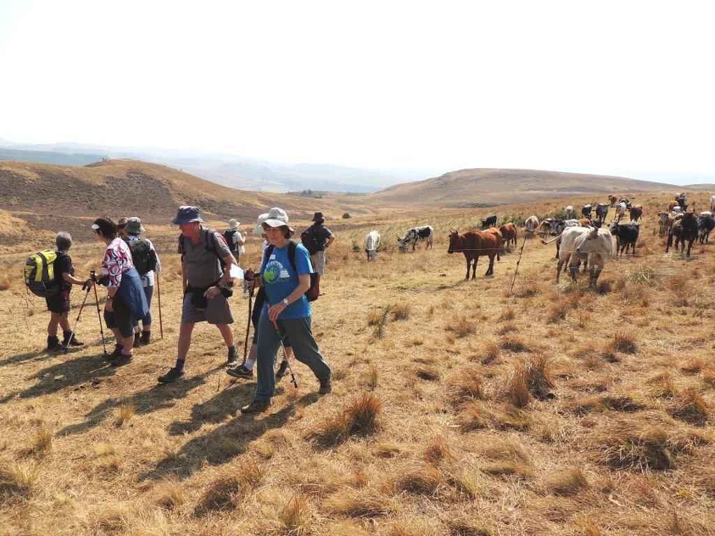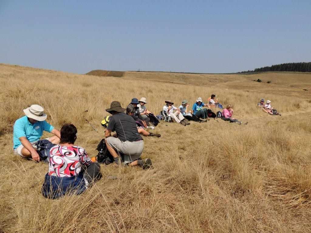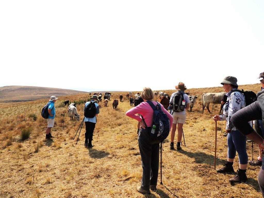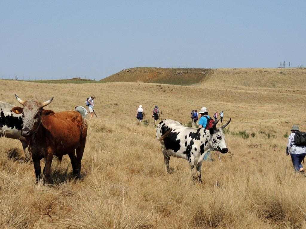 Moving on, a large group of Blesbok stormed away from us down the valley, and came to rest on the slopes of an adjacent hill. By now some hunger pangs were becoming evident, so a sunny, grassy spot ( where we stood), was the lunch spot. Carrying on after a rest, an electric cattle fence barred our way, however a place was found where we could lift the fence, and go under. The cattle thought we were bringing food, and jostled around us to look for the cattle lick that they were expecting. Luckily, no one was licked, but by now the hot sun was starting to lick into the energy of some of the walkers. As we crossed under the second electric fence, the animals were forced to stay in their allotted area of grazing.