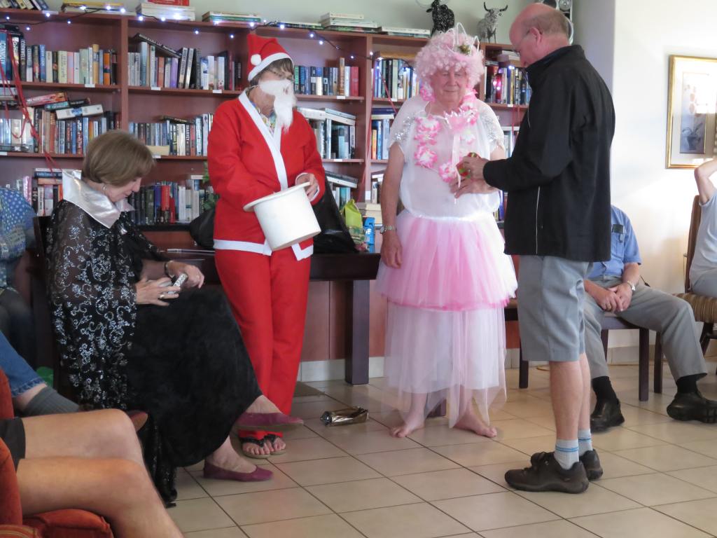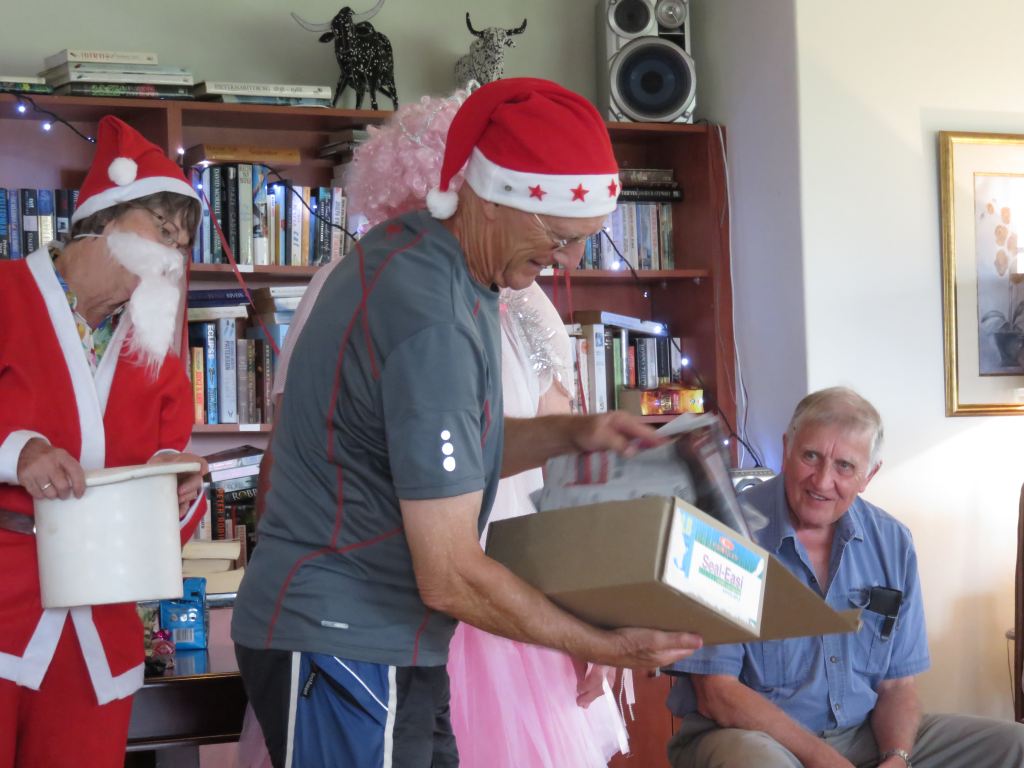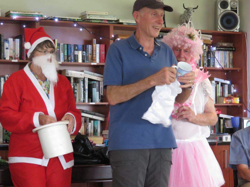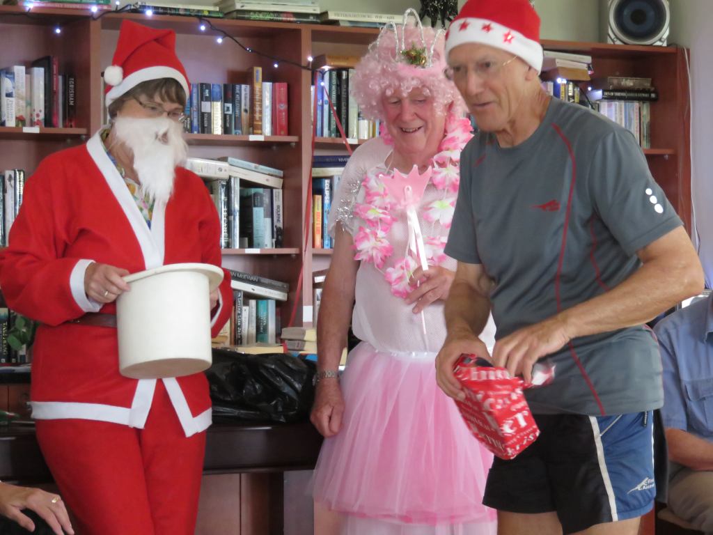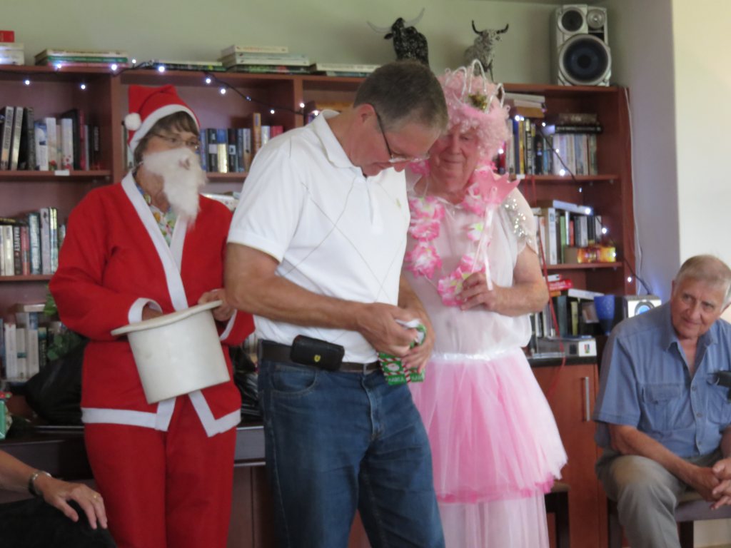 SECRET SANTAIt was then that "Father Christmas" and her "Fairy" (resplendant in his new Hawaiian Marshmallow fairy outfit) pranced into the room to hand out presents to all the good boys and girls of the Hiking Club who had brought presents to share. A change in the way the present giving/taking washandled this year caused some confusion at first however the members were soon into the swing of keeping their eye on their favorite present.The way it now works: The Fairy draws a number, the holder of that number is read out and may (1) elect to select any gift that has already been opened and is being held by a member (the member relieved of their original gift goes to the Christmas sack and selects a new present) or (2) select an unopened gift from the Christmas sack of presents. If the number holder chooses to take your gift from you, you may not (unless you are Brigitta...) refuse to surrender it, in this way the top gifts (other than Brigitta's torch) may change hands quite a few times.