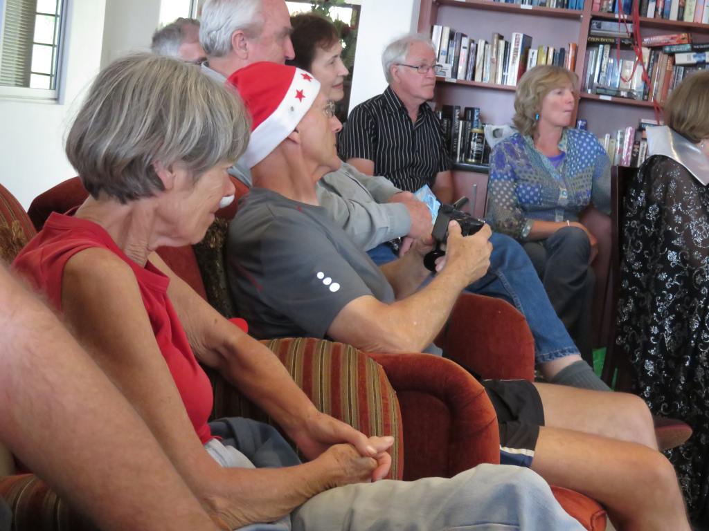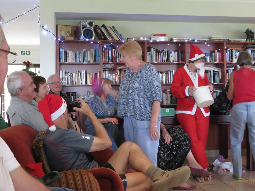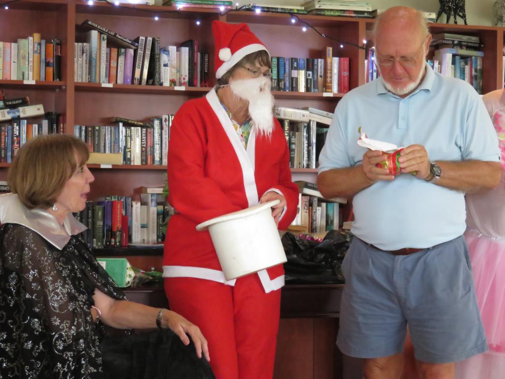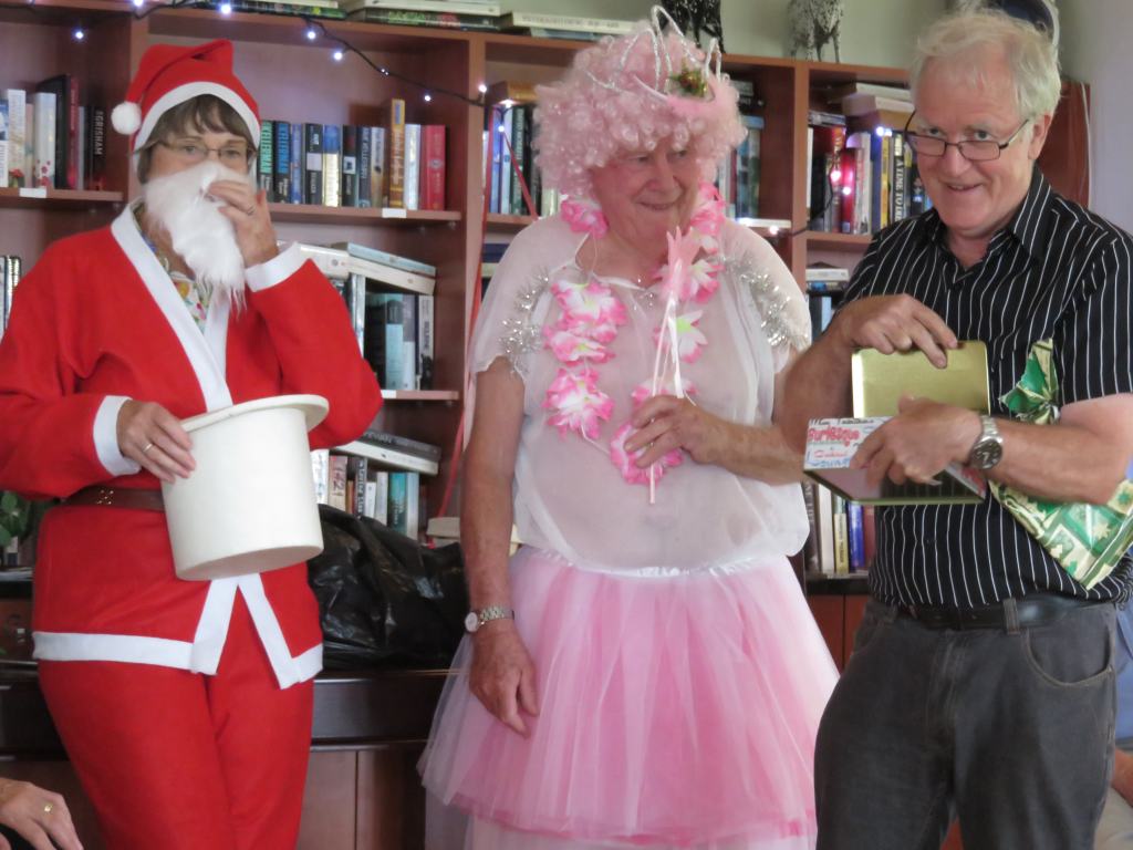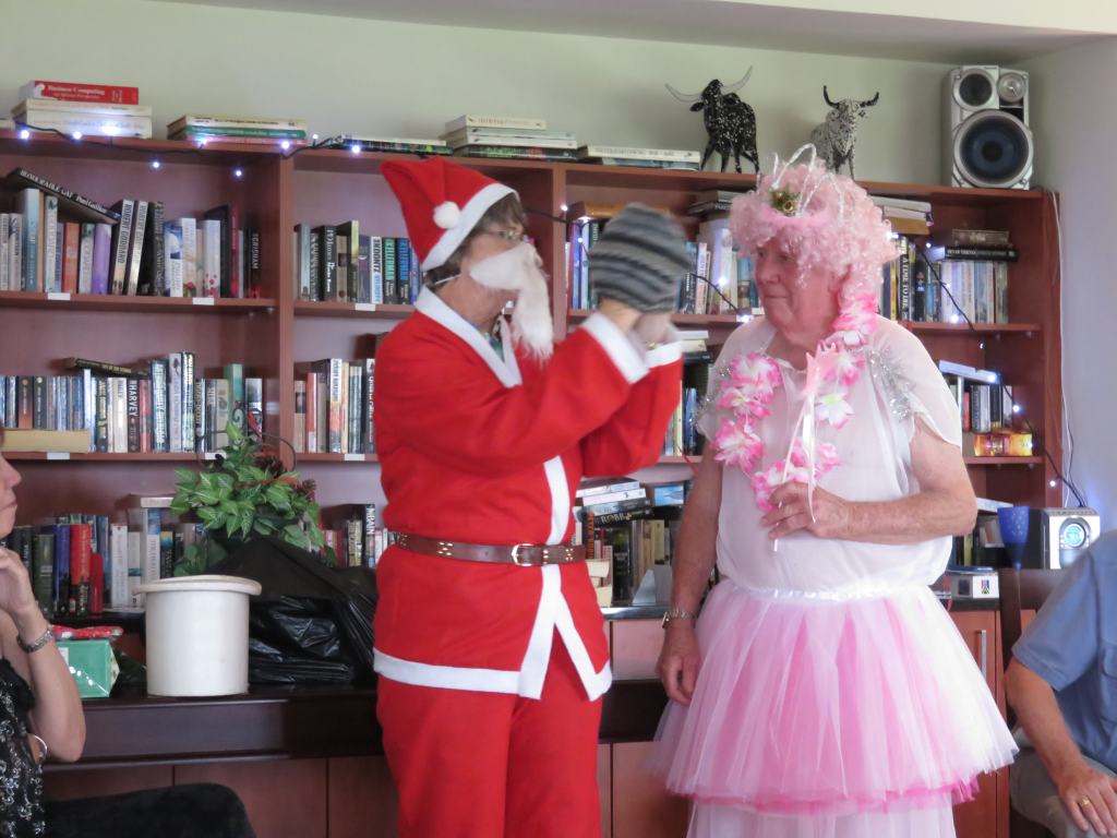 SECRET SANTAIt was then that "Father Christmas" and her "Fairy" (resplendant in his new Hawaiian Marshmallow fairy outfit) pranced into the room to hand out presents to all the good boys and girls of the Hiking Club who had brought presents to share. A change in the way the present giving/taking washandled this year caused some confusion at first however the members were soon into the swing of keeping their eye on their favorite present.The way it now works: The Fairy draws a number, the holder of that number is read out and may (1) elect to select any gift that has already been opened and is being held by a member (the member relieved of their original gift goes to the Christmas sack and selects a new present) or (2) select an unopened gift from the Christmas sack of presents. If the number holder chooses to take your gift from you, you may not (unless you are Brigitta...) refuse to surrender it, in this way the top gifts (other than Brigitta's torch) may change hands quite a few times.