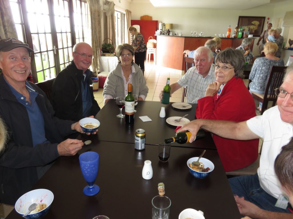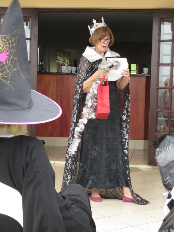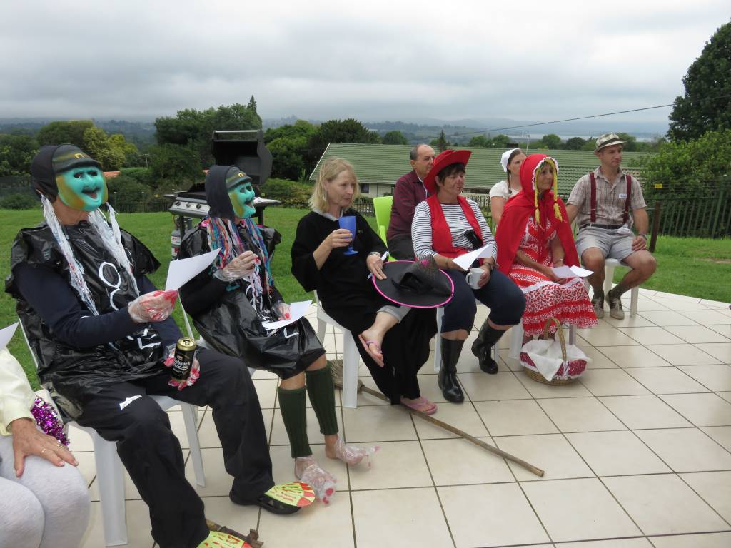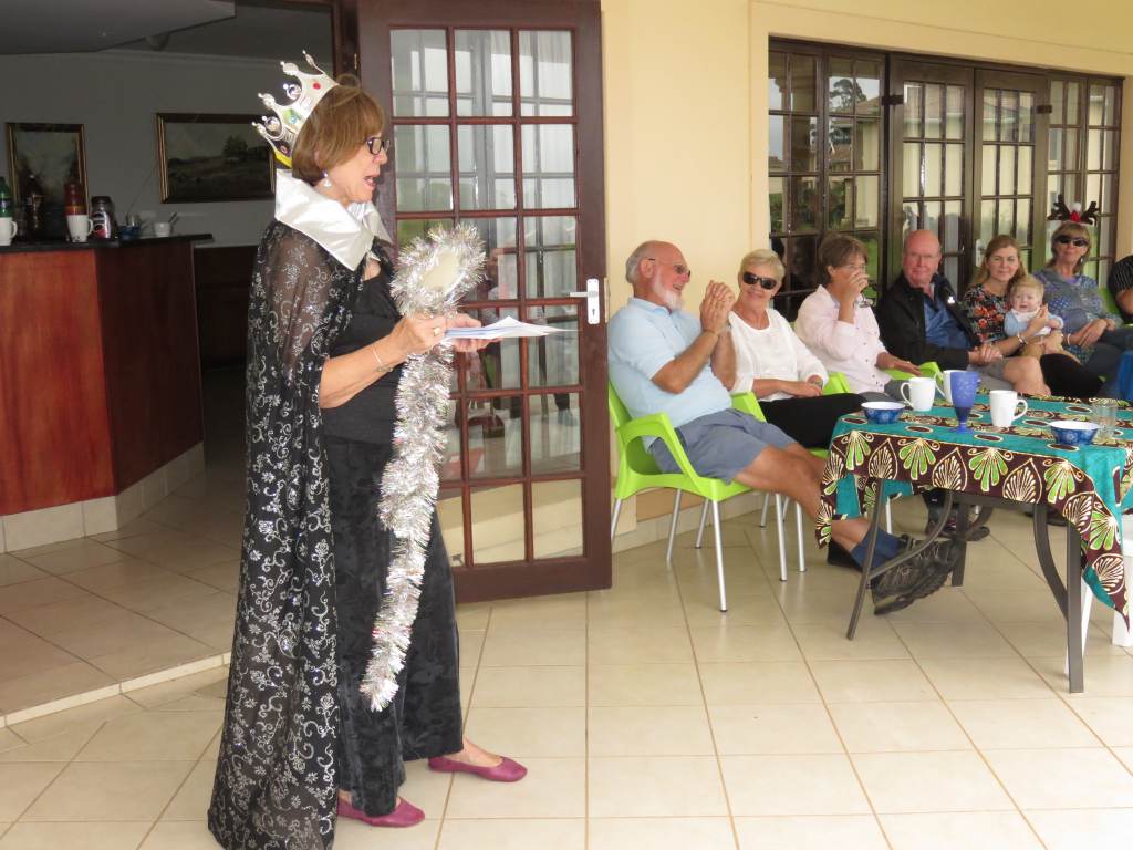 Held at EAGLE RIDGE ESTATE, Howick 6th December 2015 Report and photos by Rod Hart (Extremely annoying snowflakes courtesy of the Webmaster) [CLICK ON PHOTOS TO VIEW FULLSIZE - or view pics in accompanying SIMPLEVIEWER Presentation] ![]() EAGLE RIDGE ESTATE Clubhouse Following the hike, back at Eagle Ridge Estates, Brigitta once again filled the roll of Master-of-ceremonies, or rather "Evil Queen", as she was so dressed to go along with the party theme of Fairytale characters. So the "Evil Queen" led us in singing of Christmas carols followed by a quiz on the topic of Fairytales - some rather difficult questions sorted out the problem of people shouting out the answers and had the majority of members scratching their memories for answers - nice little chocolates for those who did get the correct answers in first.