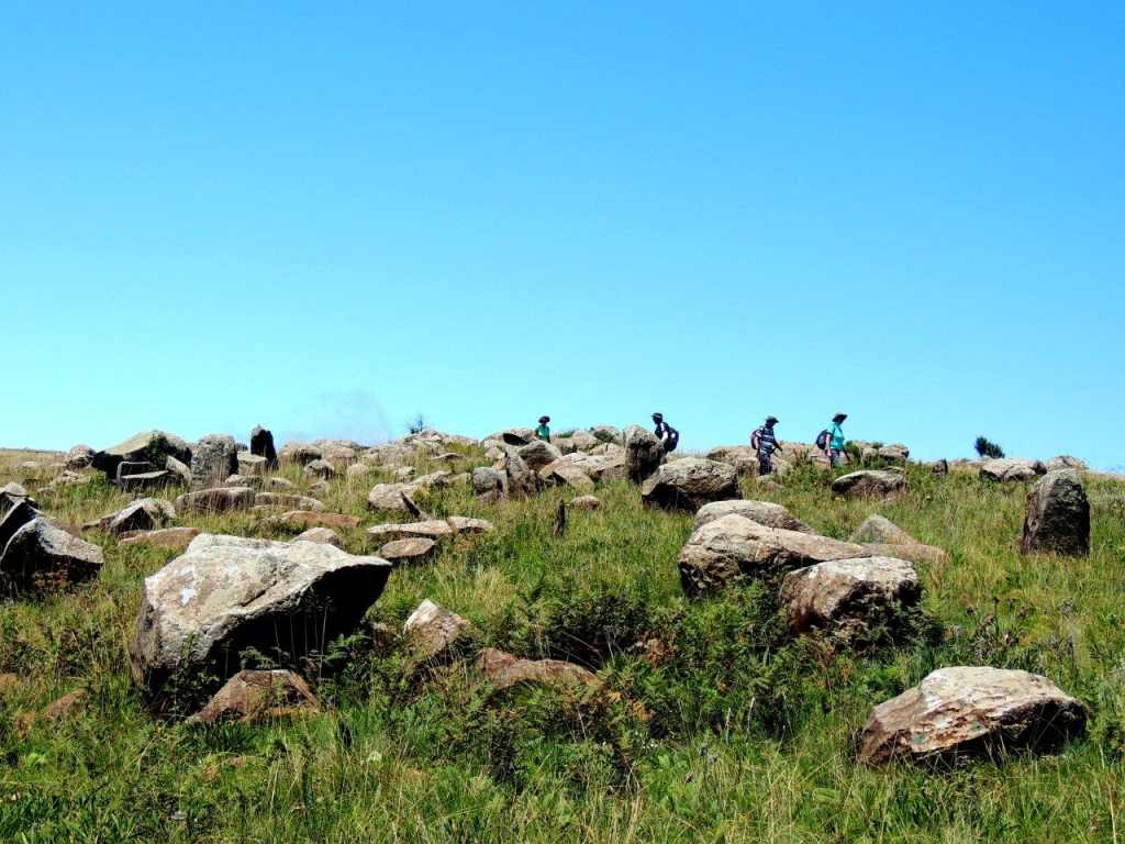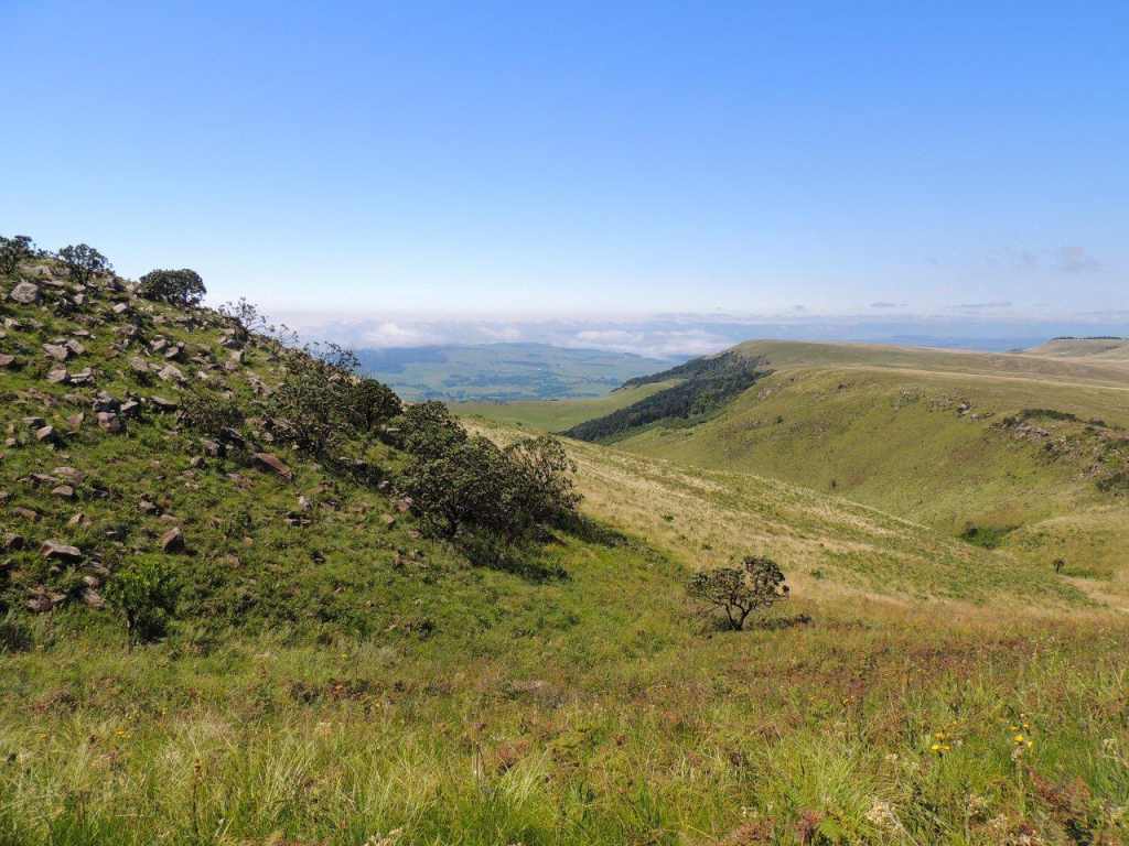 Far off in the distance Albert Falls dam was just visible. It looked as if some giant hand had taken the rocks from the vlei and wetland area and thrown them onto the high ground. They formed very interesting shapes and formations, with many sharp edges pointing to the sky. Far away to the west, if you knew where to look, was an old abandoned EKZN Wildlife field rangers outpost.