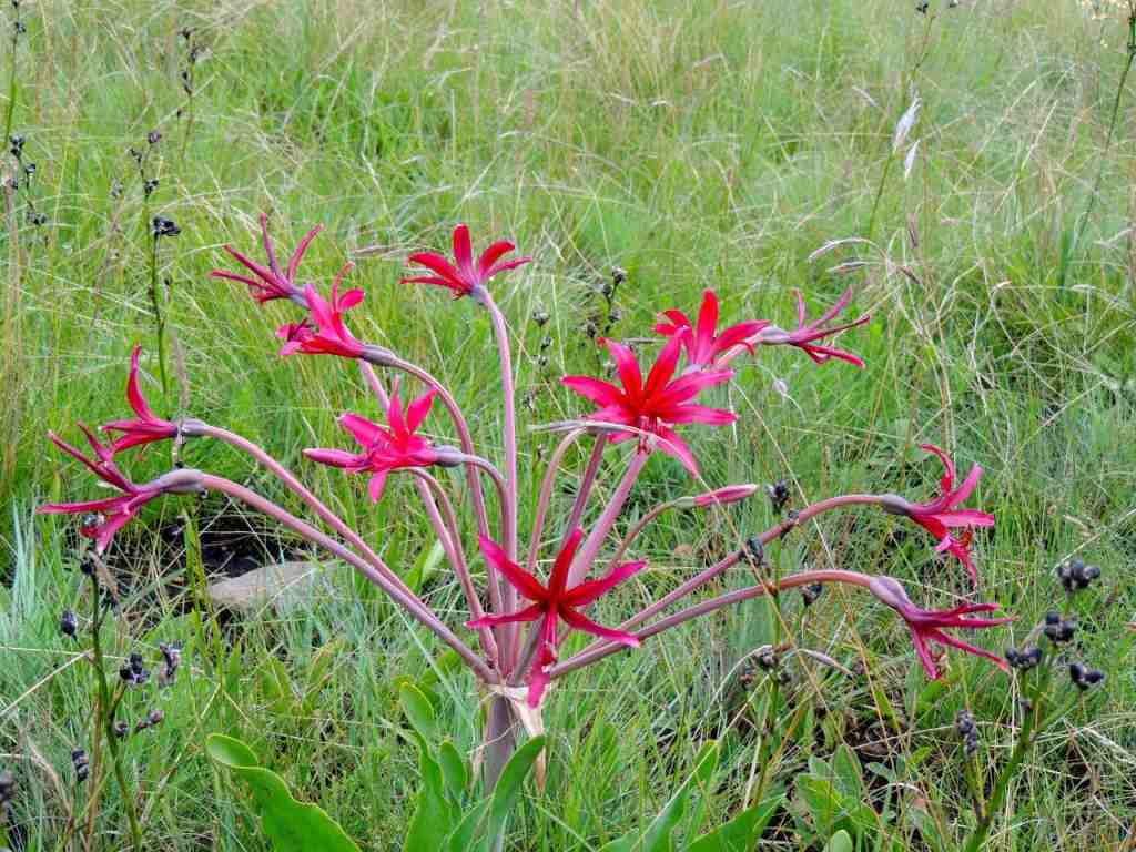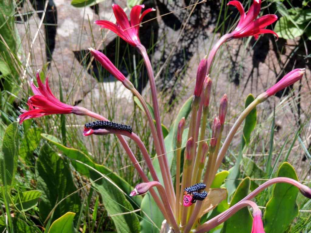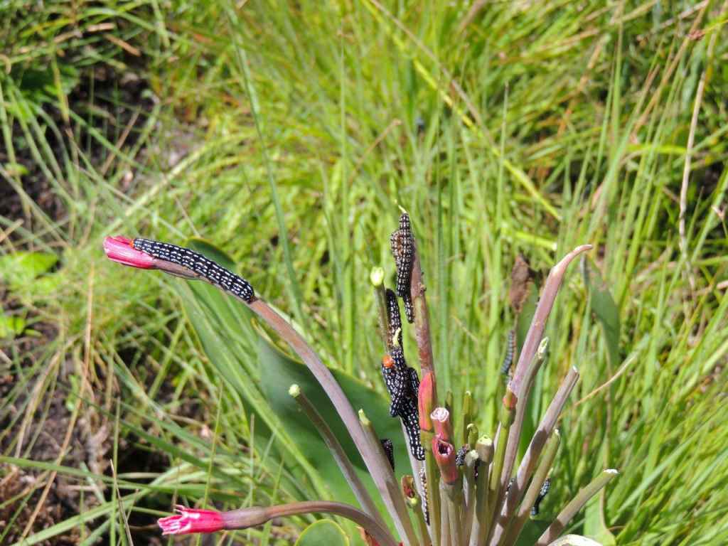 ( I had done a recce on Tuesday to this area and found a small clump of 4 Brunsvigia with beautiful red flowers. On Sunday , 5 days later the plants were near destruction being eaten by a large number of black and white striped caterpillars. With no seed head having been produced, one must wonder how the species can proliferate? )