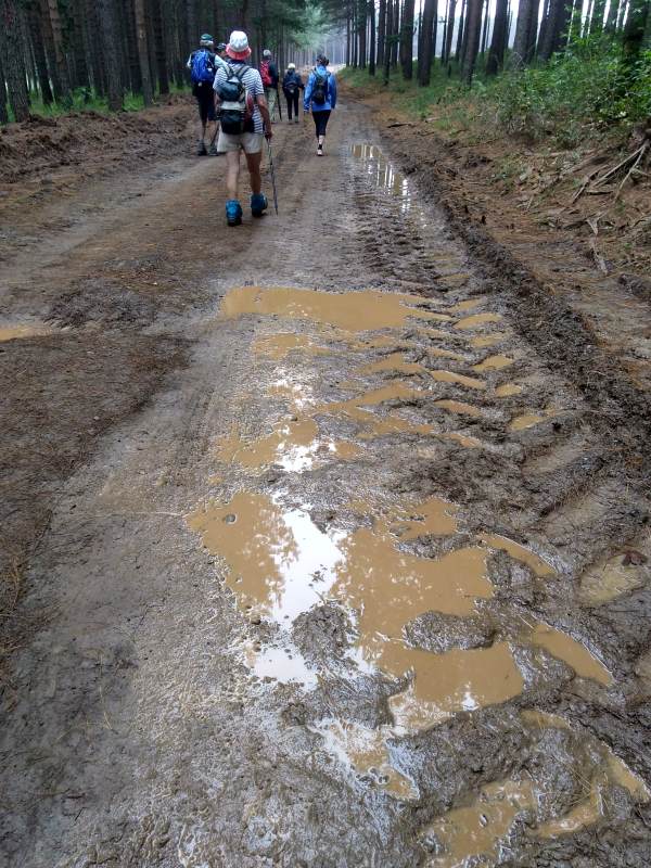 Our normal route past the dam and into the forest was hindered because the dam was overflowing meaning we could not get through to the border fence. We retraced our route adding an extra 3 kms and took an alternative route into the forest. Despite the drizzle we happily made our way around numerous puddles and obstacles to join up with the arterial forest road and onto the picnic area some 5 kms on. (9kms to this destination)