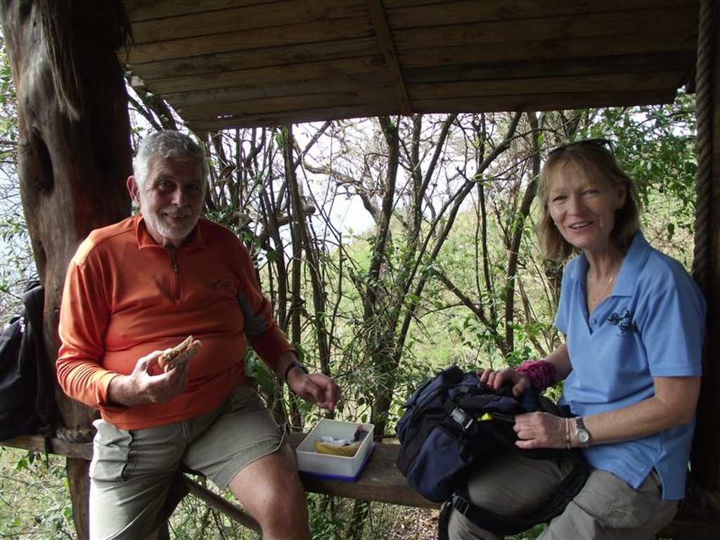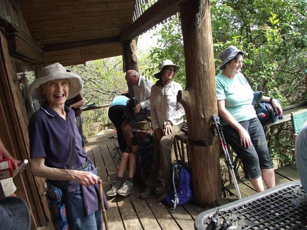 Then it was downhill again and through some lovely indigenous bush which included bush tunnels, a bit like an obstacle course. We eventually reached the promontory looking down to where the Karkloof River joins the Umgeni River as it makes its way towards Albert Falls Dam. Next we made our way to Cecil's lovely rustic but comfortable home made "Shack" where we enjoyed a relaxed lunch in beautiful surroundings - Karkloof Falls could just be seen through the haze from the shack veranda.