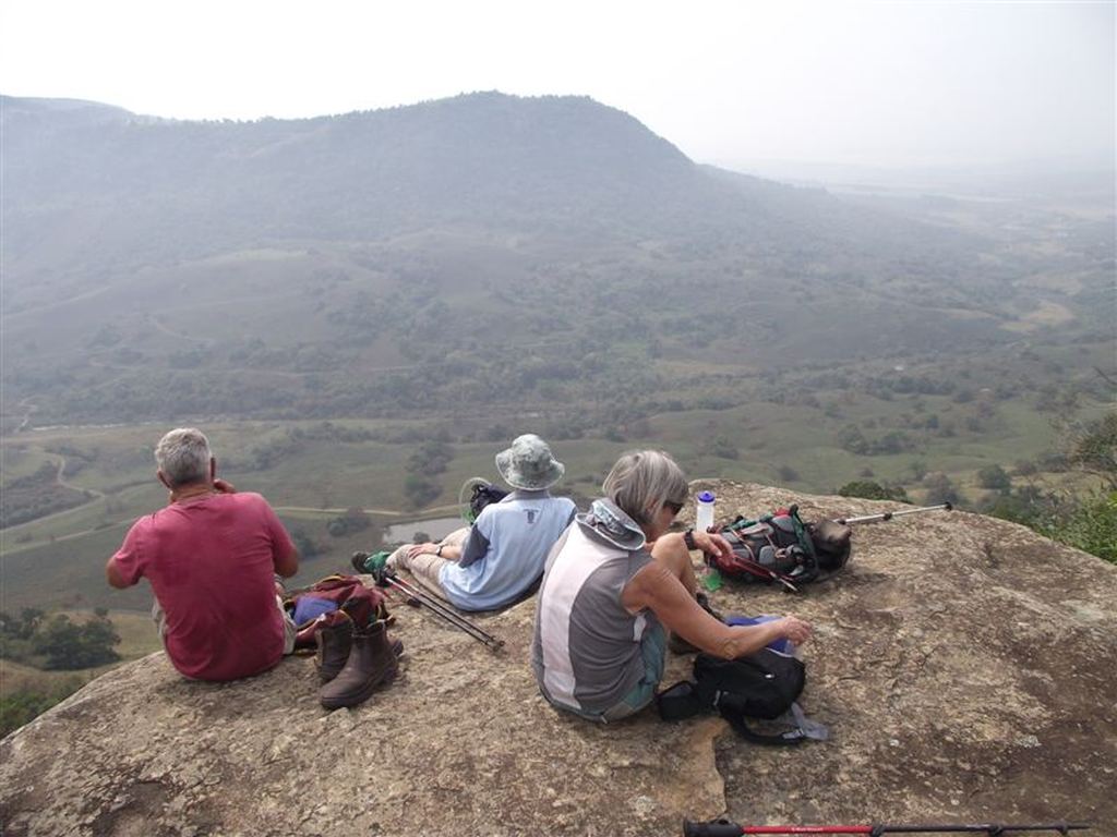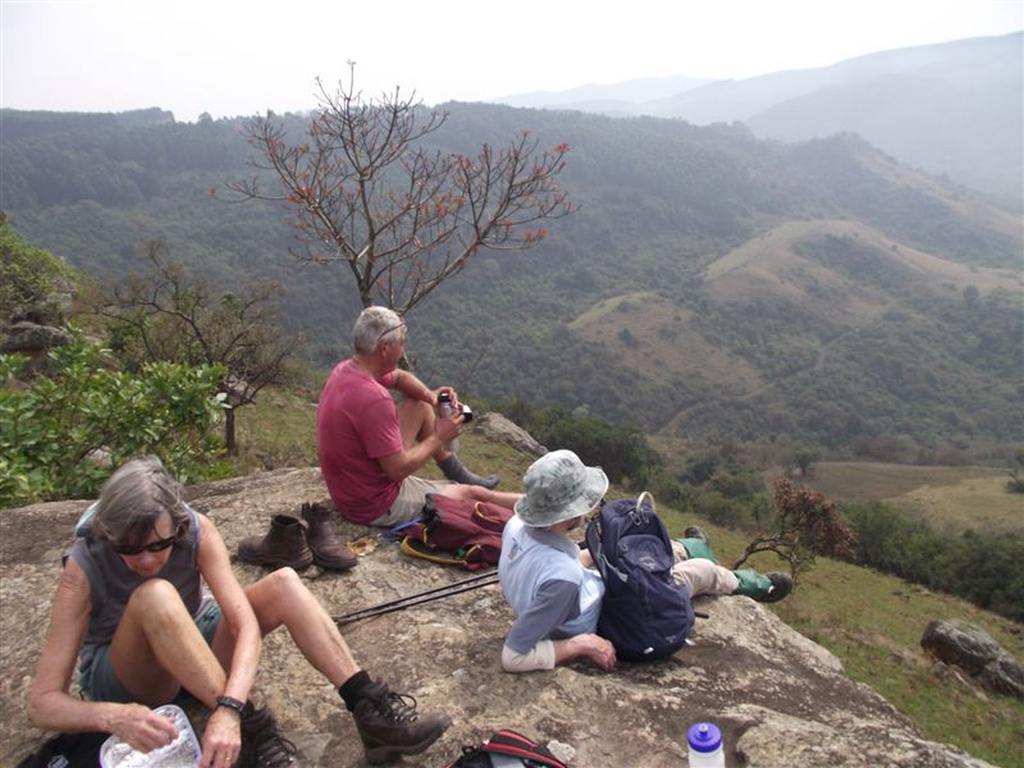 After about 8 km we had a break for drinks and snacks at a lovely rock on the escarpment looking down into the Karkloof River Valley far below with magnificent but hazy views of Karkloof Falls in the distance as well as a panoramic view towards Albert Falls Dam.