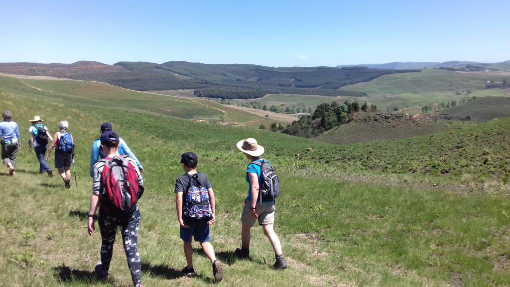 It was a hike with rolling gentle hills, a river walk, a dam, Ngunis, blesbok sightings and lovely views across the Balgowan valley. Fresh green grass was springing up after the burning. The river walk was mossy, shady and a narrow path but pretty with the indigenous trees and thick bush forming a canopy overhead. Nobody slipped on the rocks this time!