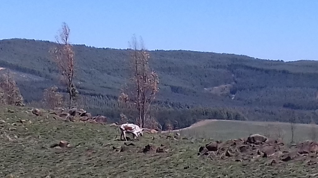 We encountered the Nguni herd near Alex dam, scattered over the hill slope, grazing on the fresh green grass. Many had calves and their young were cute and furry with lovely markings. Further on, we were so fortunate to witness a rare sight on the opposite hill - a Nguni cow had just dropped her calf. We saw a dark shadow at her backside. She turned around and started licking her newborn. But she was aware of us, concerned and protective, so we moved on away from her.
