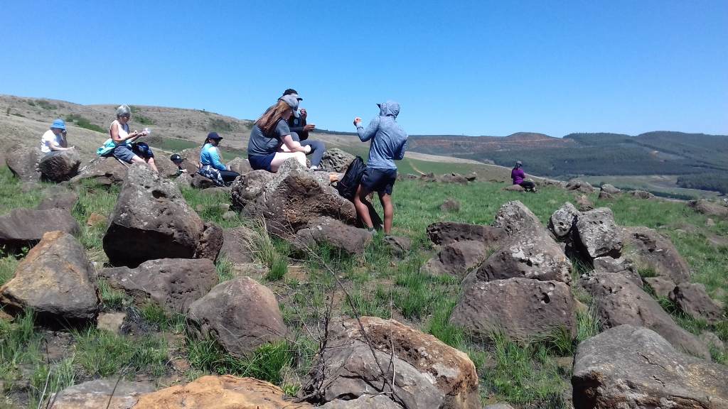 We sat on a high rocky outcrop for our snack. The wind was fresh and dry so liquid re-fuelling was important. The views over the Michaelhouse buildings and farmland of the Balgowan valley were lovely. On our way again, we came to a divergent path. 5 of the group opted to go back. As the leader, I don' t like to split the group, but one of our members was battling and 3 visitors had an appointment to get to. The cars were within sight so it wasn't a difficult walk back.