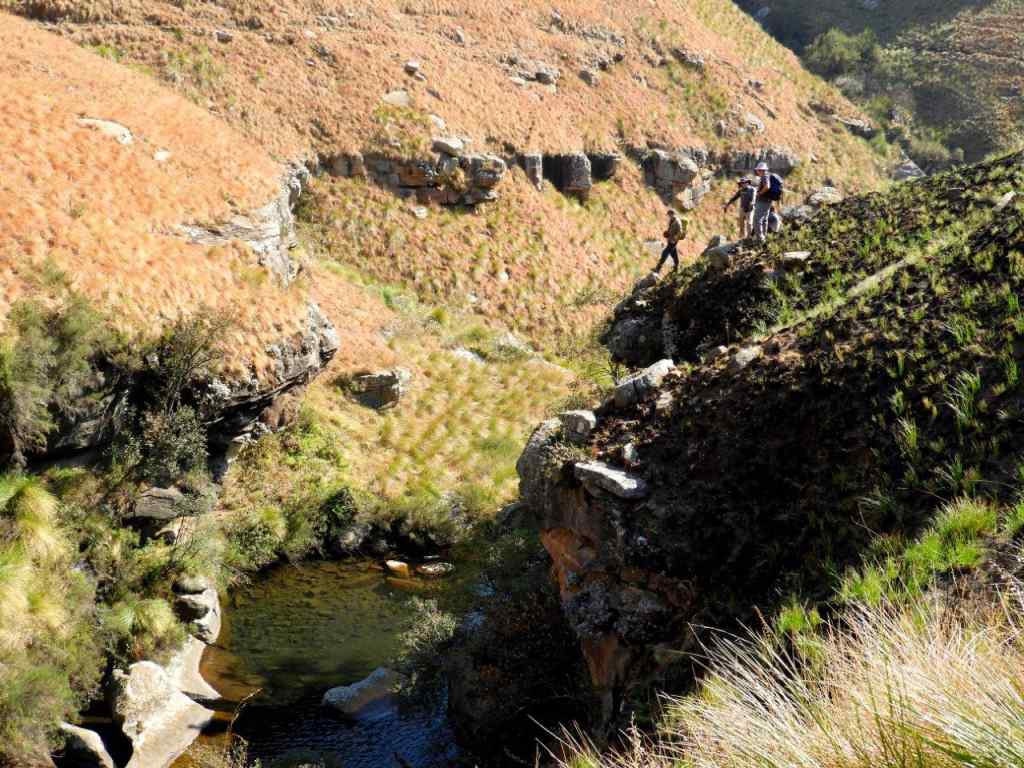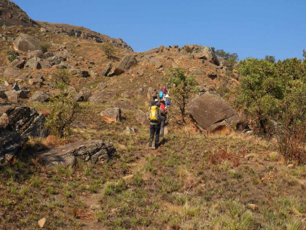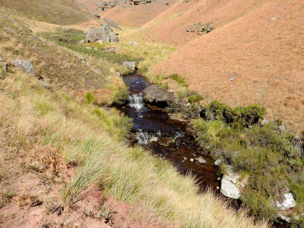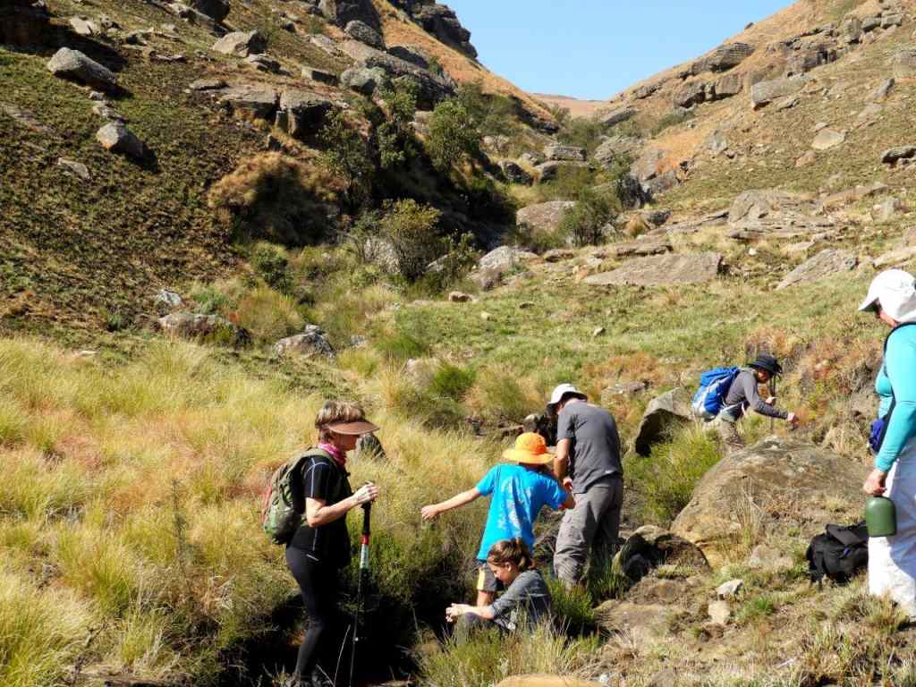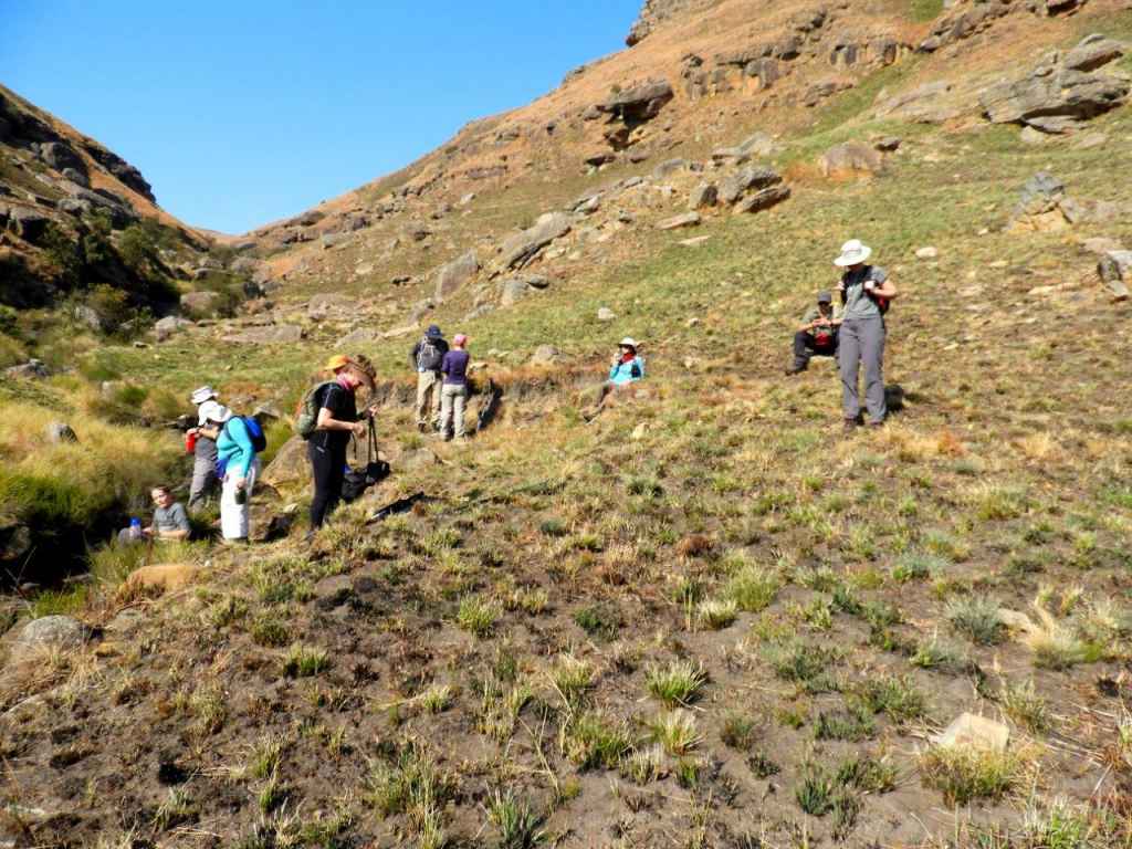 The day was bright and clear, with the Giant standing out on the skyline all day. The first part was following a well-worn path, then later we turned off onto an old Eland track, and then once in the valley, the tracks were lost and we did some serious "side of the cliff walking" which took its toll on the ankles, and made for serious eye and foot concentration to traverse the side of the steep valley, with a steepish drop down into the stream. Some parts of the mountain had been burnt, but the lower edge alongside the stream was unburnt and very difficult to walk on as the grass was long, slippery, and in places quite hard and sharp "Porcupine Grass". The first steep climb soon set hearts racing, and the old animal was badly eroded and full of stones. Later at the first stream crossing a break was had, and water bottles filled.