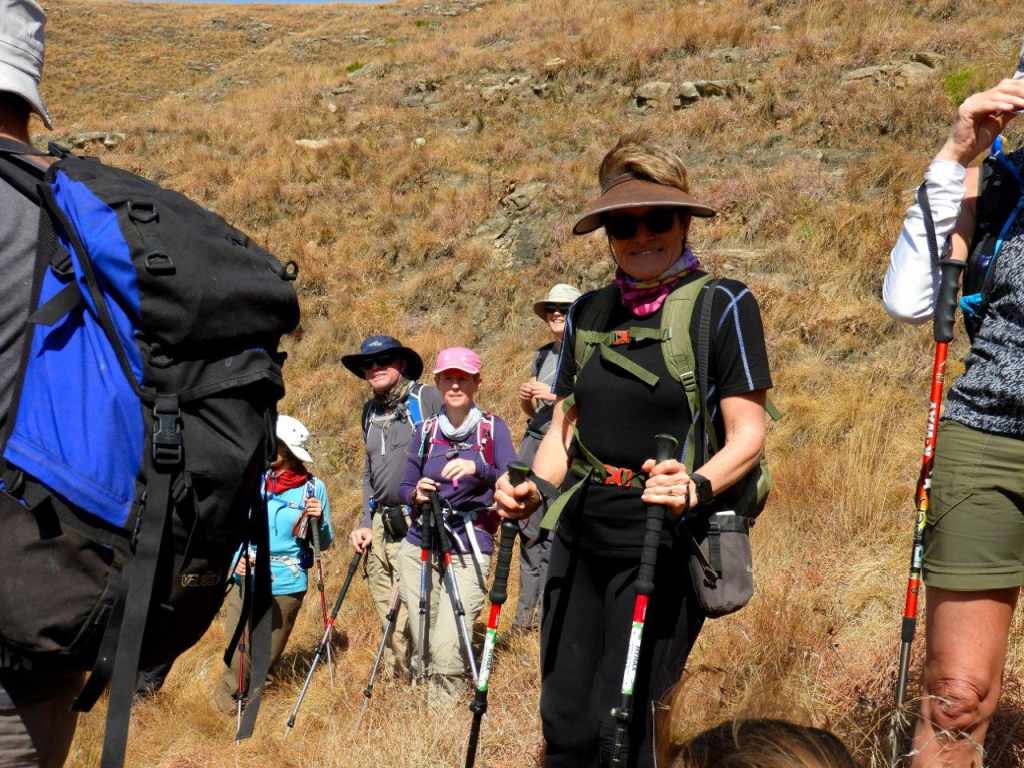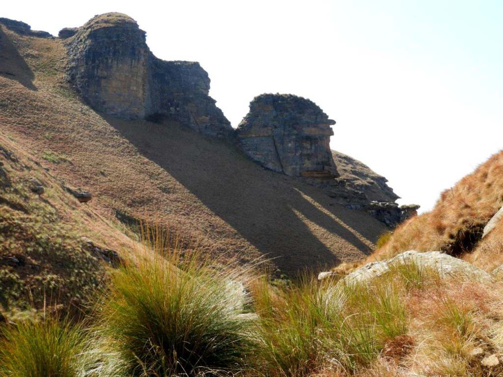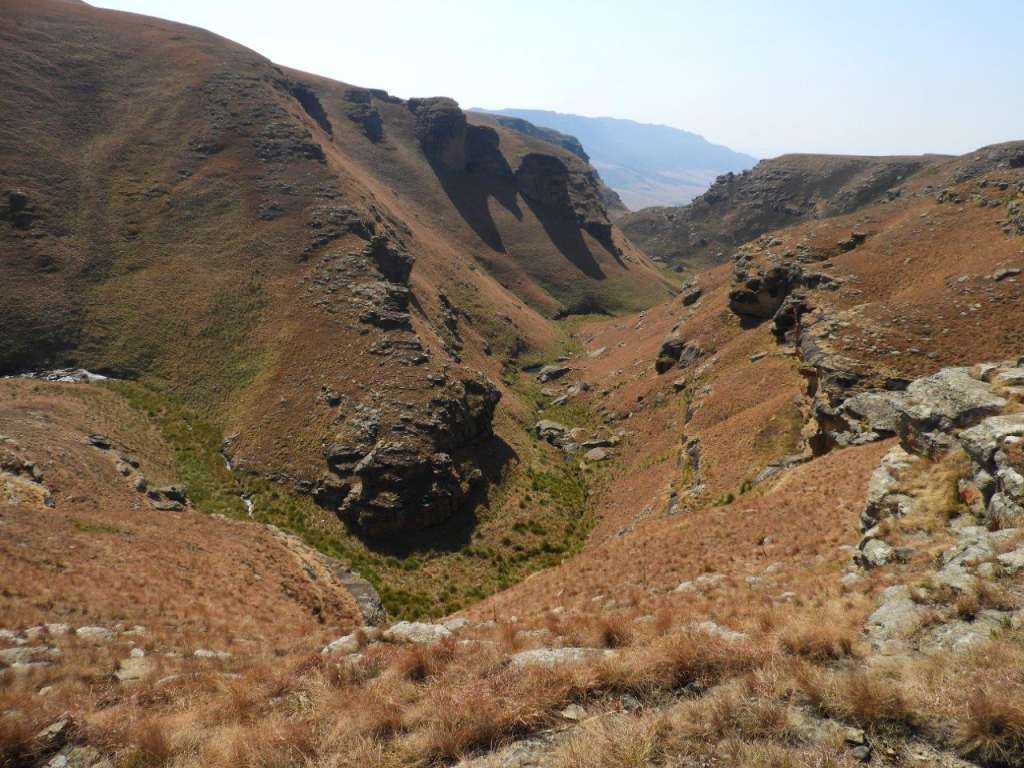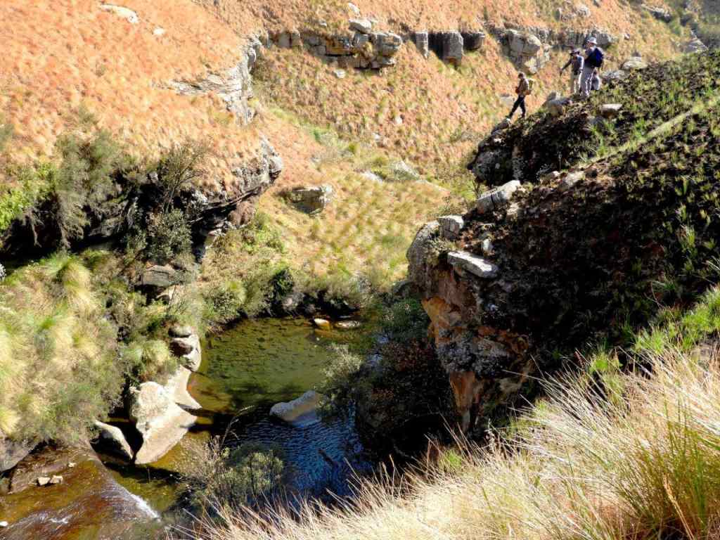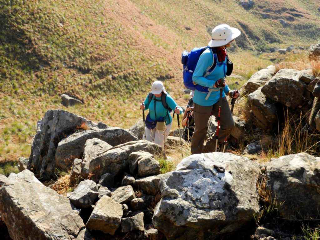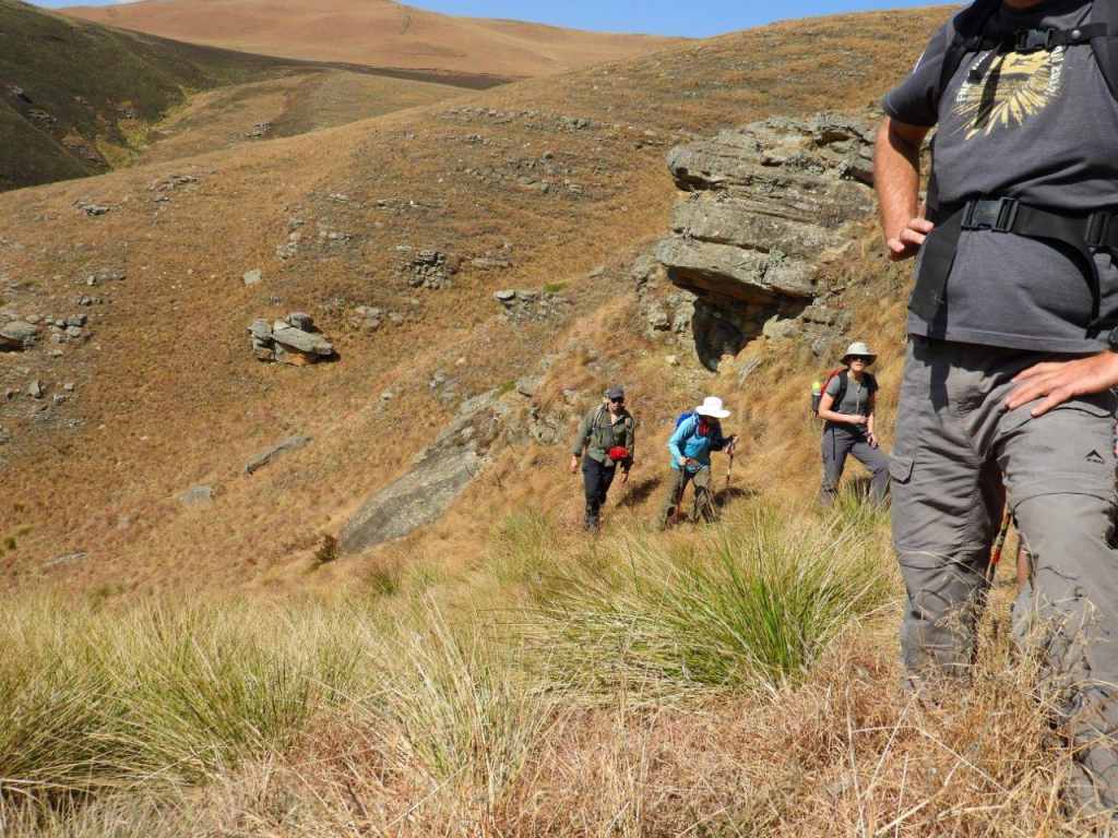 The day was bright and clear, with the Giant standing out on the skyline all day. The first part was following a well-worn path, then later we turned off onto an old Eland track, and then once in the valley, the tracks were lost and we did some serious "side of the cliff walking" which took its toll on the ankles, and made for serious eye and foot concentration to traverse the side of the steep valley, with a steepish drop down into the stream. Some parts of the mountain had been burnt, but the lower edge alongside the stream was unburnt and very difficult to walk on as the grass was long, slippery, and in places quite hard and sharp "Porcupine Grass". The first steep climb soon set hearts racing, and the old animal was badly eroded and full of stones. Later at the first stream crossing a break was had, and water bottles filled.