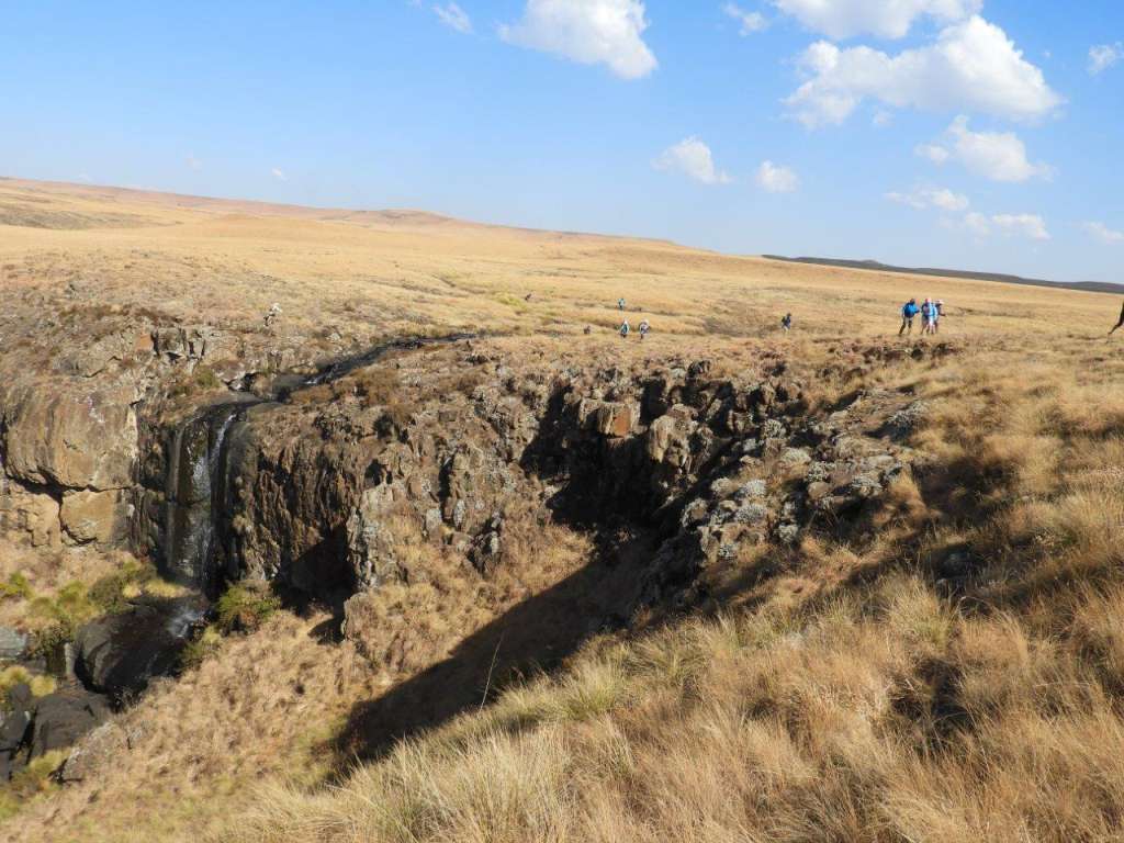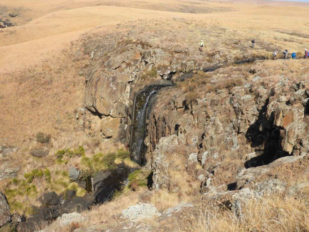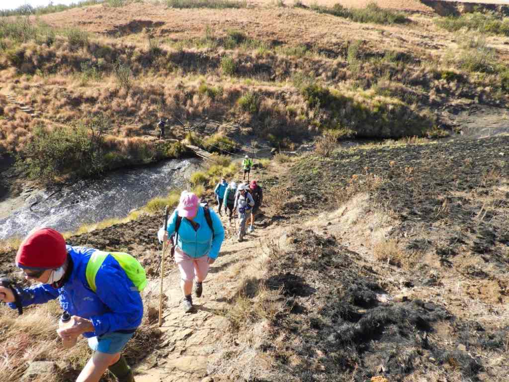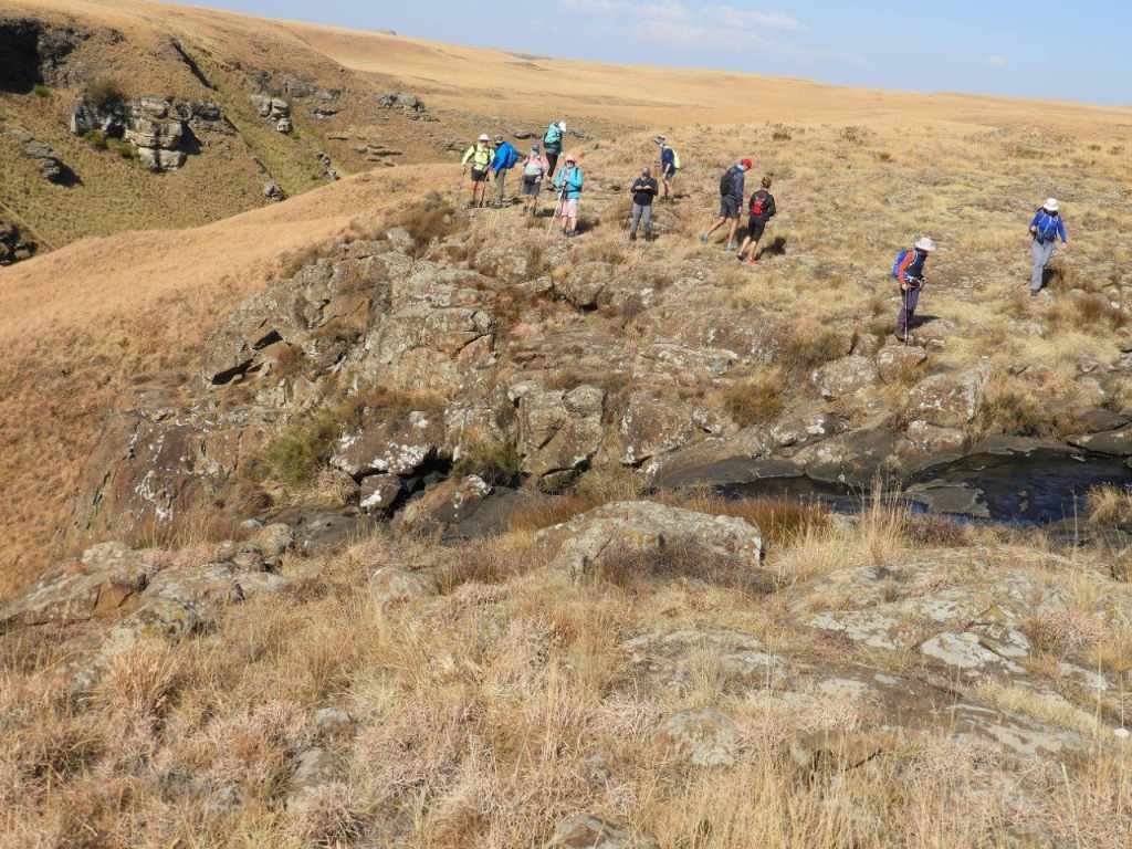 Taking a route not many hikers would know about, we set off towards Caracal Cave, then cut across country via some old animal tracks. The day was clear and cool, the sky was a crisp blue , the mountain was clear right to Monk's and Cathkin and the sooty was black ,powdery and blowy. The pace was fair with stops for some history, high points and places of interest in the berg, and a break now and then. We drifted from the path a while before the plaque and walked to the edge of the valley to look down into the incredible valleys below and in front of us. Breathtaking when it is green and clear. As always the hulk of Giants Castle was always in view.
