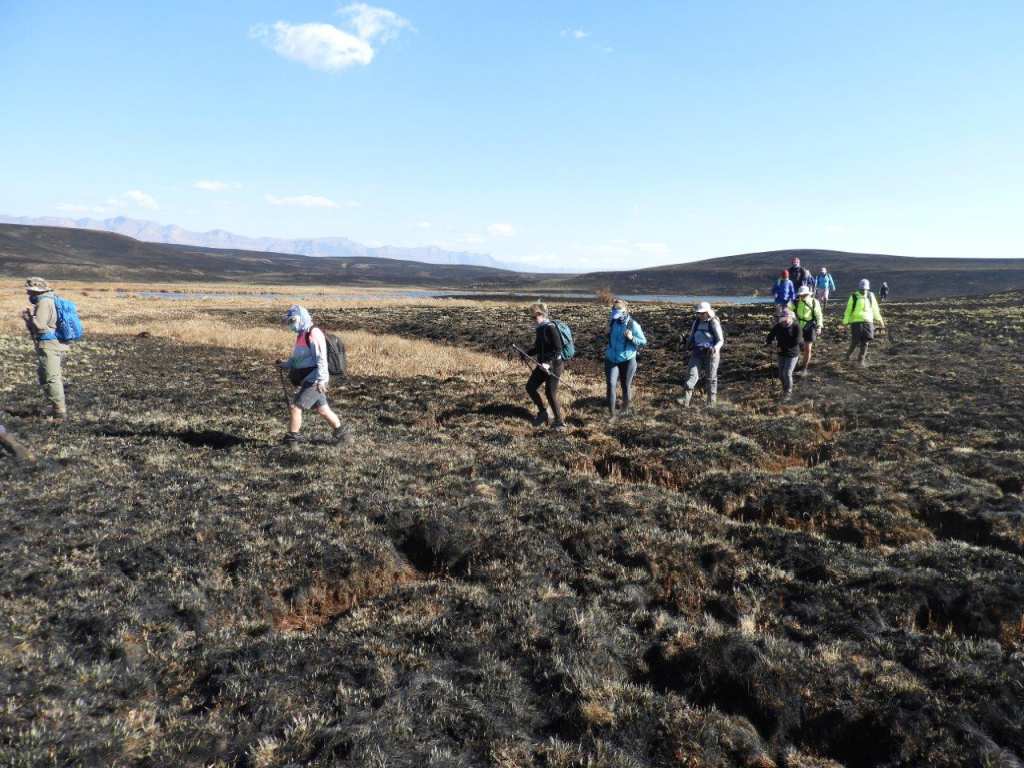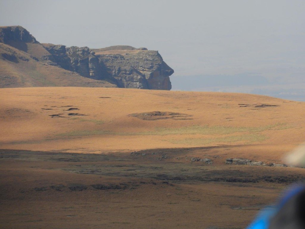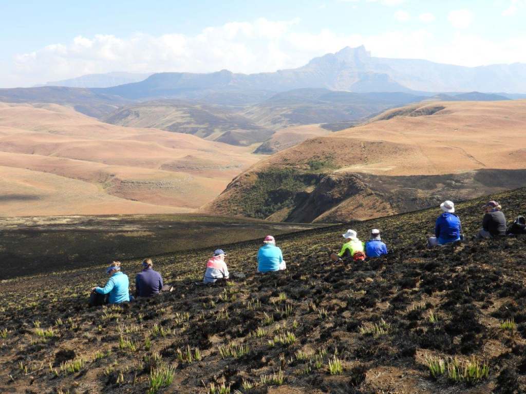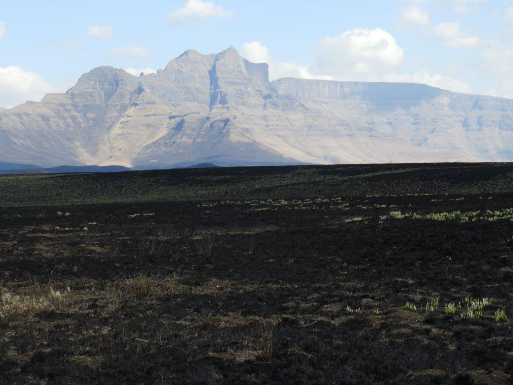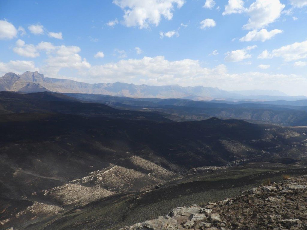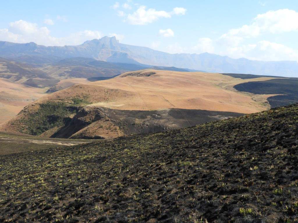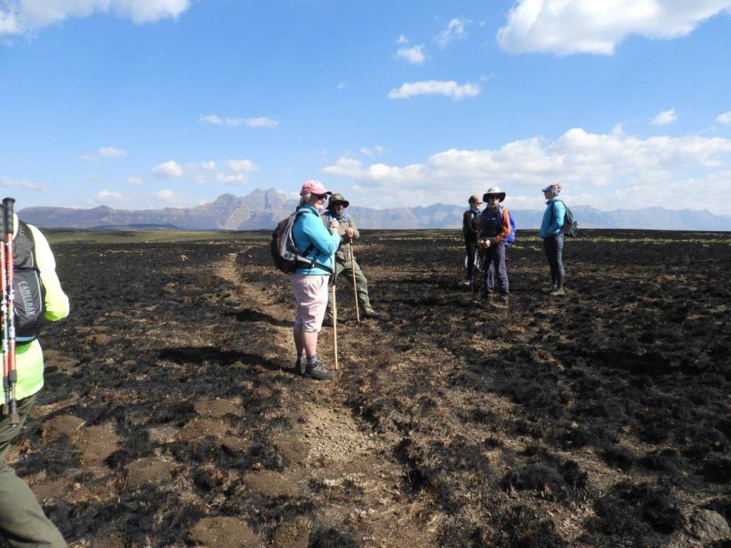 From here we followed the road back the way we had come for some distance, then picked up a game trail that tokk us easily up a long hill and over the other side where we would have a lunch break, and look down into the top of the Kamberg Valley, and across to Redi Peak in the Lotheni area. In the distance we could see unburnt winter grass, however the fire that had been through the Central Berg must have been enormous, huge areas have been burnt.