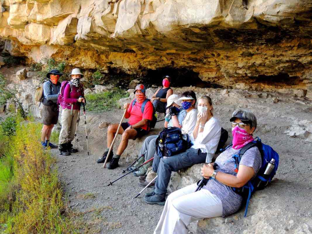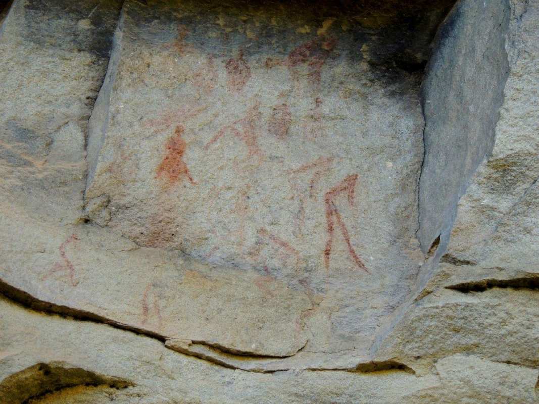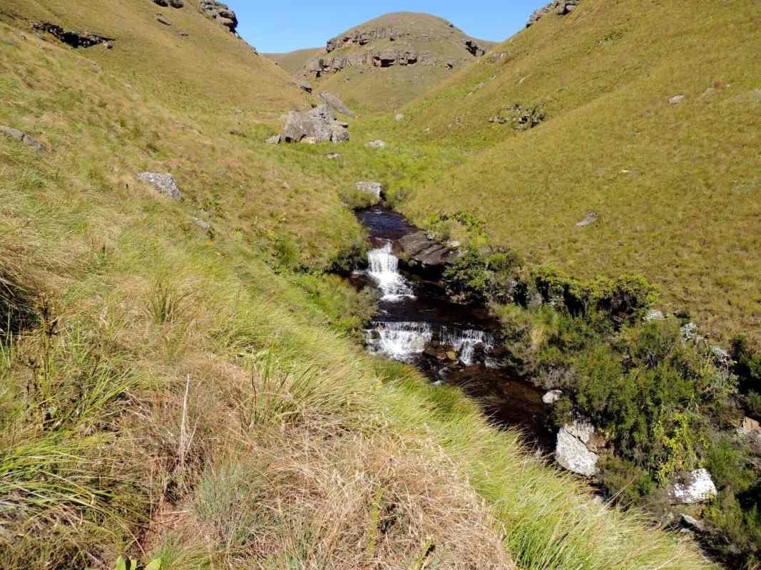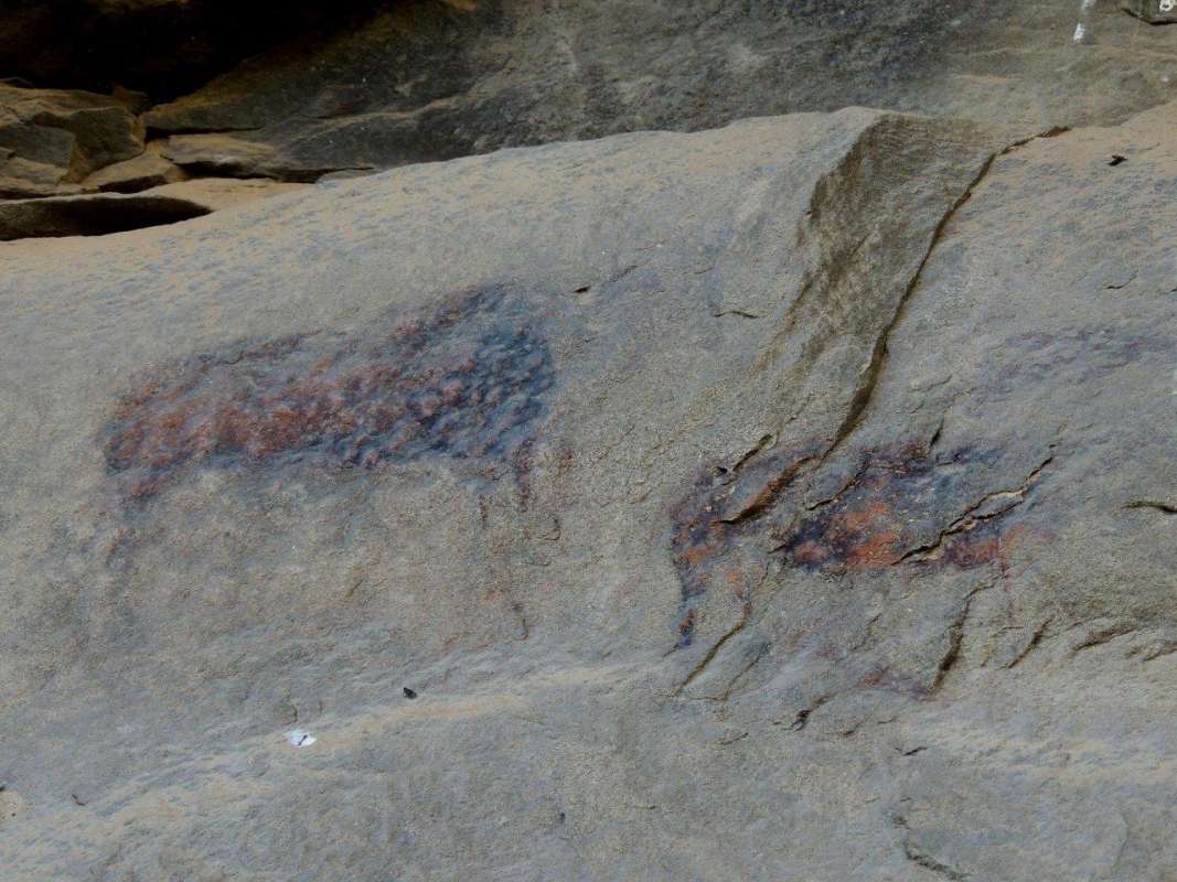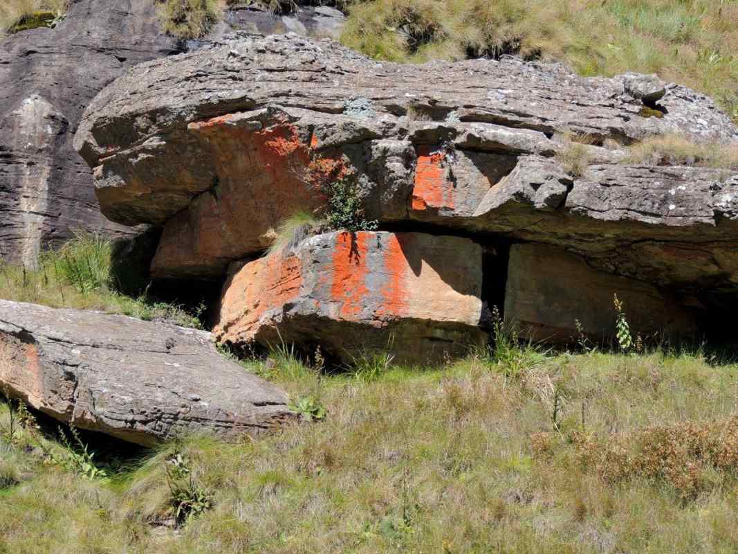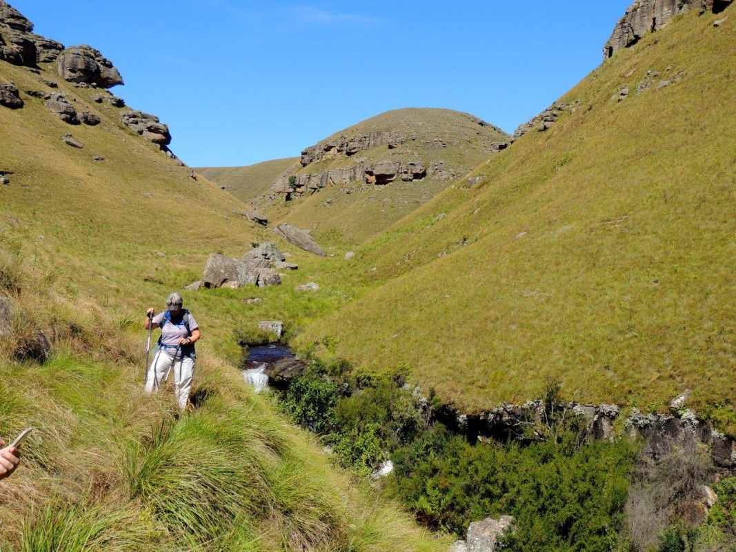 ![]() Now our problems started as we started to climb the valley, the path was washed away, overgrown and lost. It made for hard, slow deliberate stalking of the path. The river views were great with a lot of clear cool water rushing down the valley. When we were on top of the valley, our problems got worse, the path disappeared totally under the foliage. It was a matter of feeling for the old sunken path and trusting your feet to follow it. As already mentioned, there appears to be no game wandering around to keep the paths open. Where have they gone???????? The sun baked down, the going was seriously rough and tough, legs got tired as one had to lift your feet high to get over the tangled vegetation. We eventually reached a shady spot not far from our destination, where we called a lunch break, and the more hardy climbed up to the caves to look at what might be in the caves. Since my last visit here in 2019, brambles have grown profusely in 2 of the cave entrances, blocking entry into the caves and the contents of the caves. In time these cave paintings will become inaccessible to anyone. Our Natural heritage of what the San People left behind, will be lost again.
